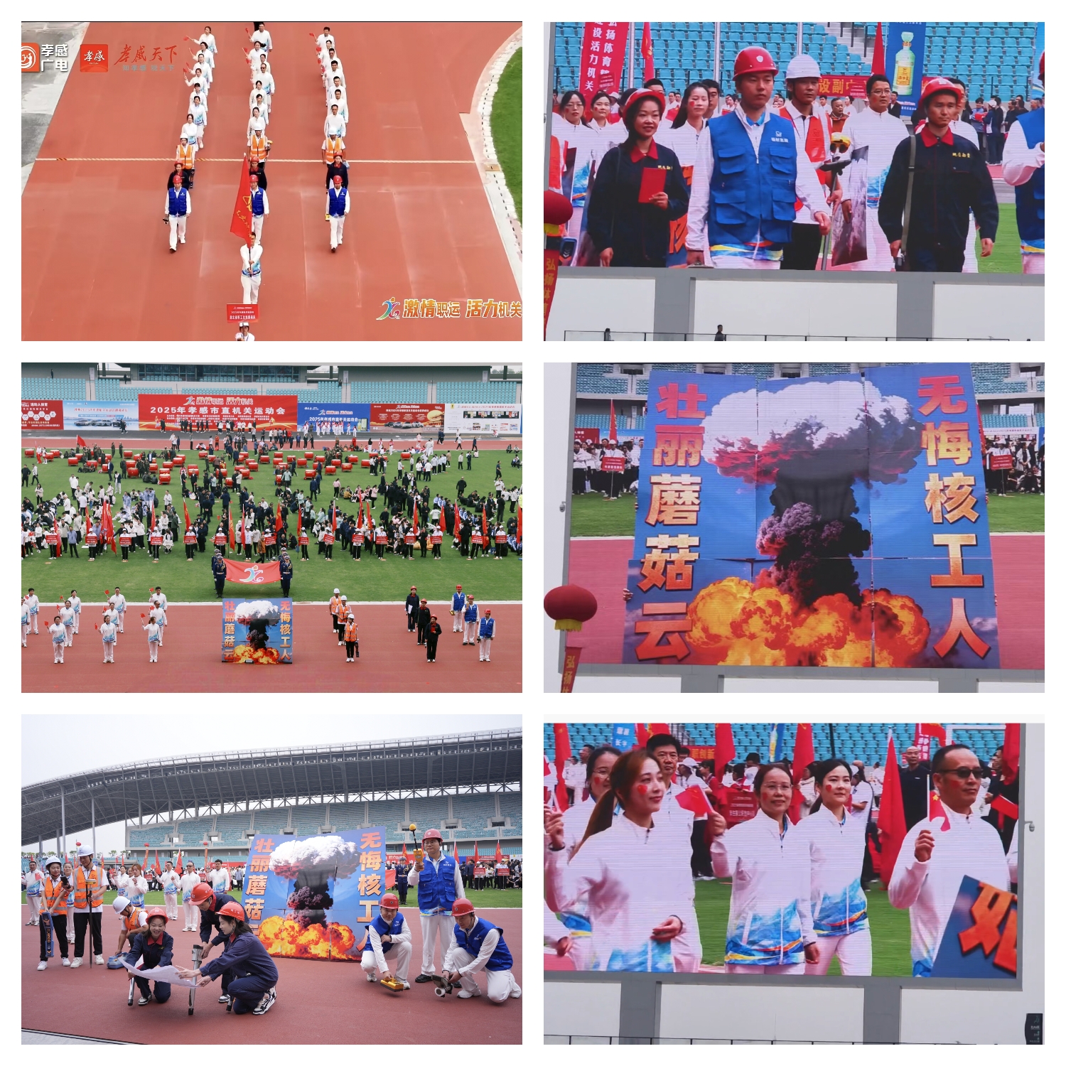 开幕式上,参赛运动员身着统一的服装,在《运动员进行曲》中迈着稳健整齐的步伐步入赛场。各代表队结合本单位职业特色精心准备了形式多样的展示内容。我局代表队方阵通过展示地质调查、工程勘察、核素检测三个工作场景,生动诠释309人“以核为本、固本开新、三驾齐驱、兴业富民”核心发展理念。巨大的蘑菇云拼图呈现原子弹的成功爆炸。“核地铁军 赛场扬威 勘探报国 再创丰碑”响亮的口号震撼全场。