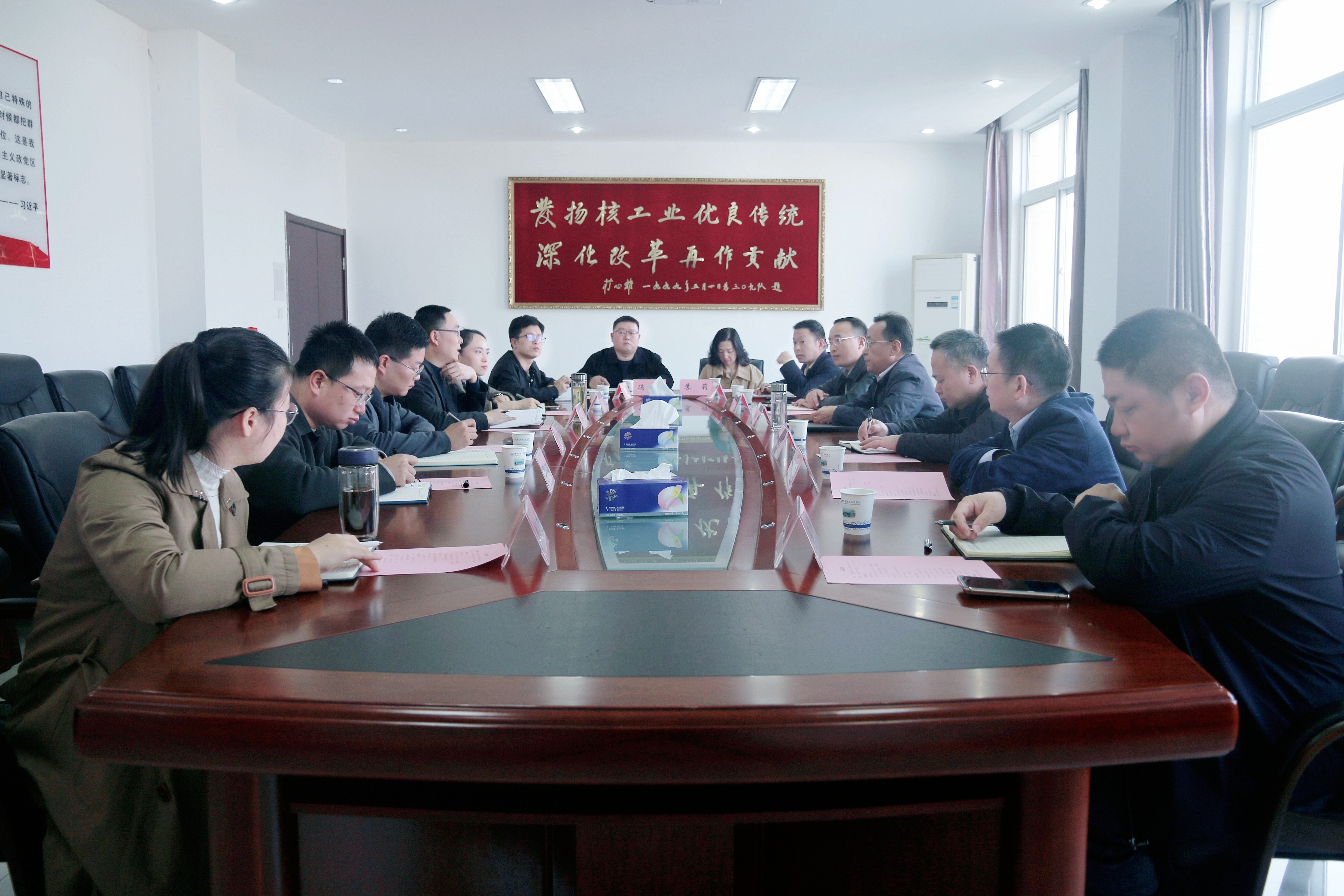 来访领导一行先后参观了局核素检测中心实验室、勘察设计院和地质调查院。通过实地参观和听取讲解,各位领导深入了解了我局发展历程、产业布局、技术优势及核心业务开展情况,对我局良好的科研基础和技术积累给予了肯定。随后,各方举行座谈会,围绕整合各方在核素检测、核技术应用、辐射防护、新材料研发等领域的优势资源,合作筹建“澴川实验室”进行深入探讨。