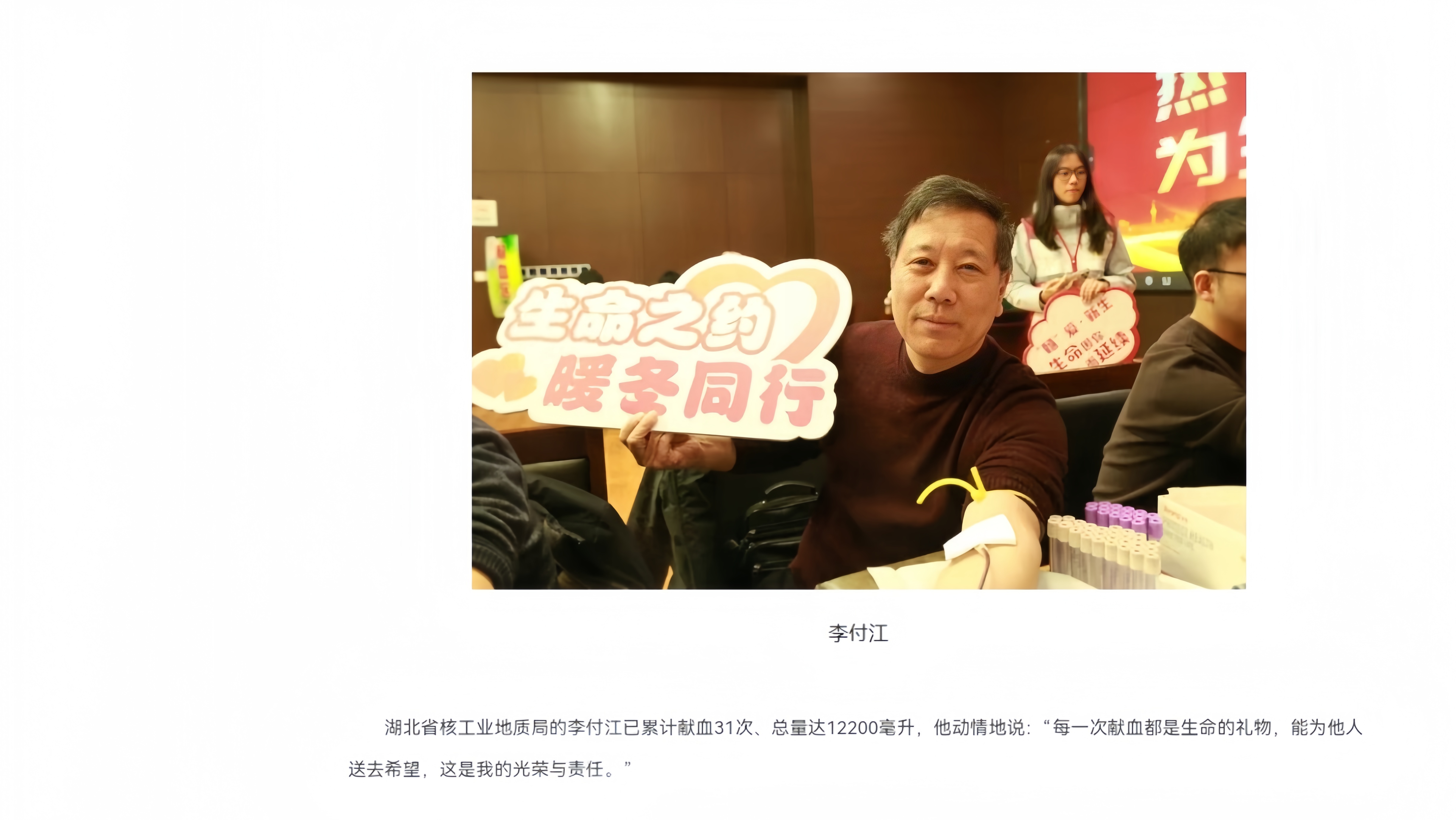 本次活动我局职工的积极参与,为有效补充我市冬季血液库存、保障临床用血安全贡献了坚实的“地质力量”。李付江同志正是这股温暖力量中一面鲜艳的旗帜。