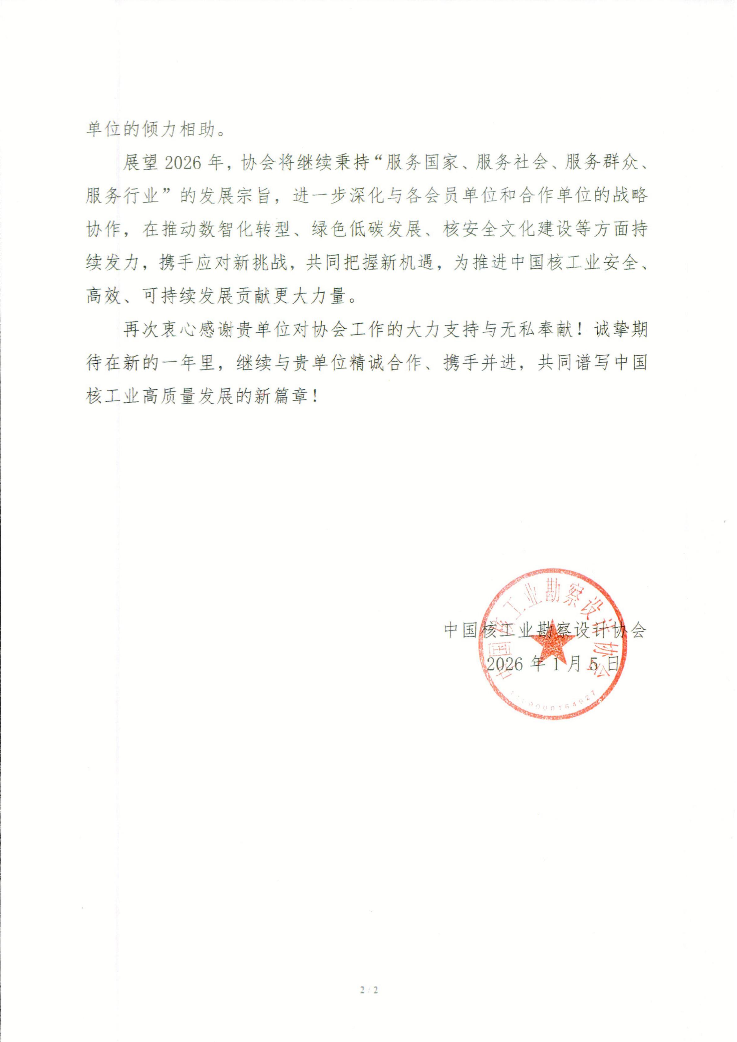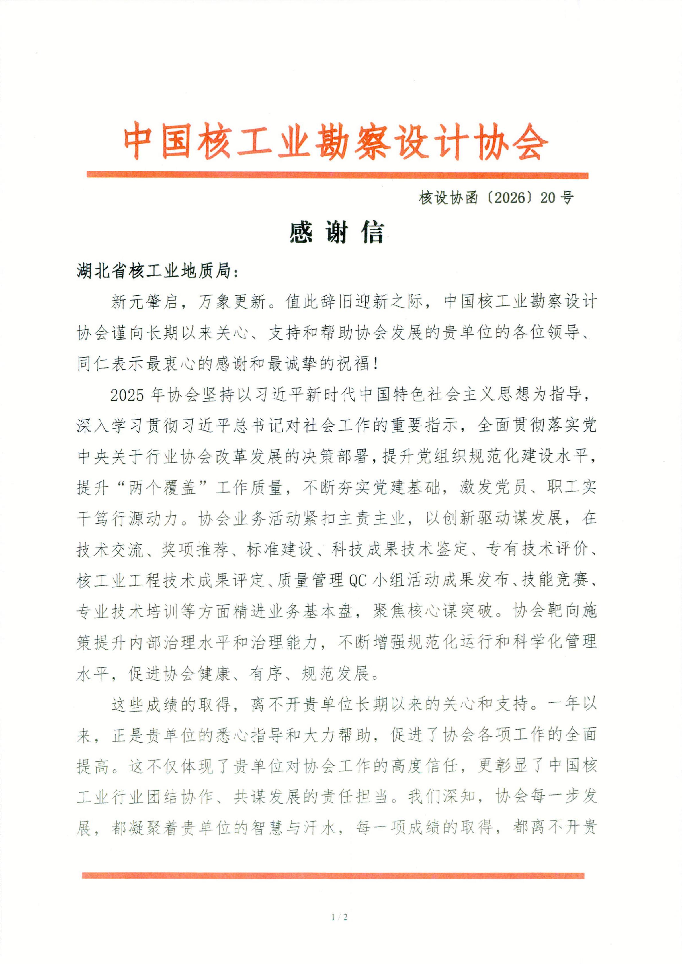 2026年1月8日,我局收到来自中国核工业勘察设计协会的感谢信。信中高度肯定了我局在长期支持协会改革发展、推动技术交流、标准建设与成果评审等方面作出的积极贡献,并对长期以来给予的关心和帮助表示诚挚感谢。