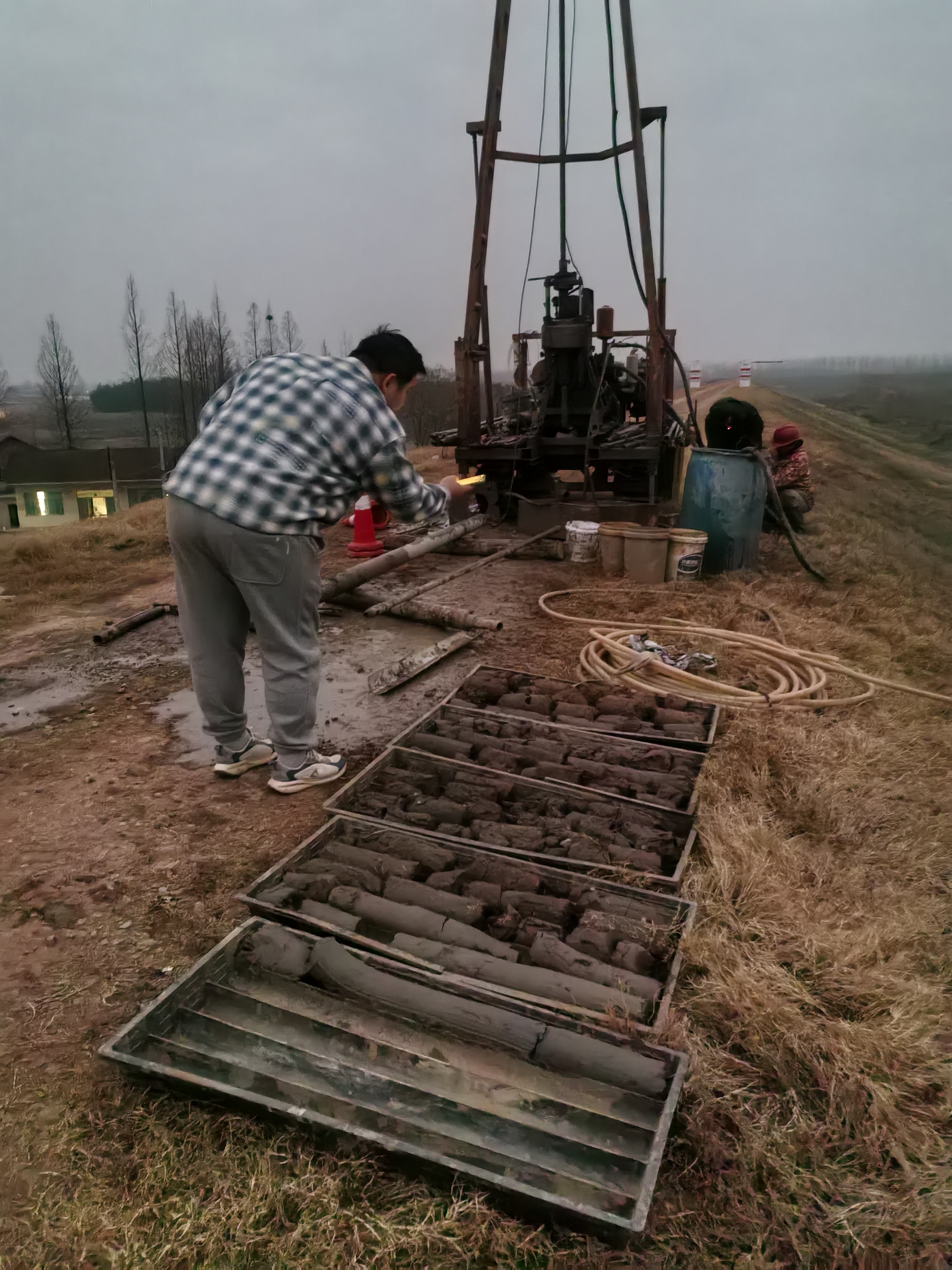 作为工程建设的“先行者”,我院抽调地质灾害评估与治理工程勘查设计专业骨干,组建成精锐技术团队奔赴堤岸一线。在勘察现场,李昌祺、冯世程带领团队顶风冒寒,坚守在堤岸、滩涂等作业点,严格遵循“逐段排查、精准布孔、科学取样”的原则,在17公里岸线上规划布设120余个勘探钻孔。